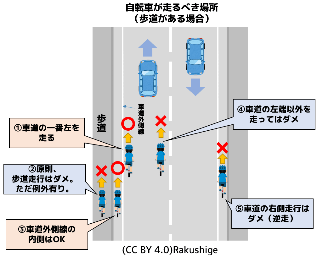 ただし、例外として「自転車通行可」の標識がある歩道や、13歳未満・70歳以上の高齢者、