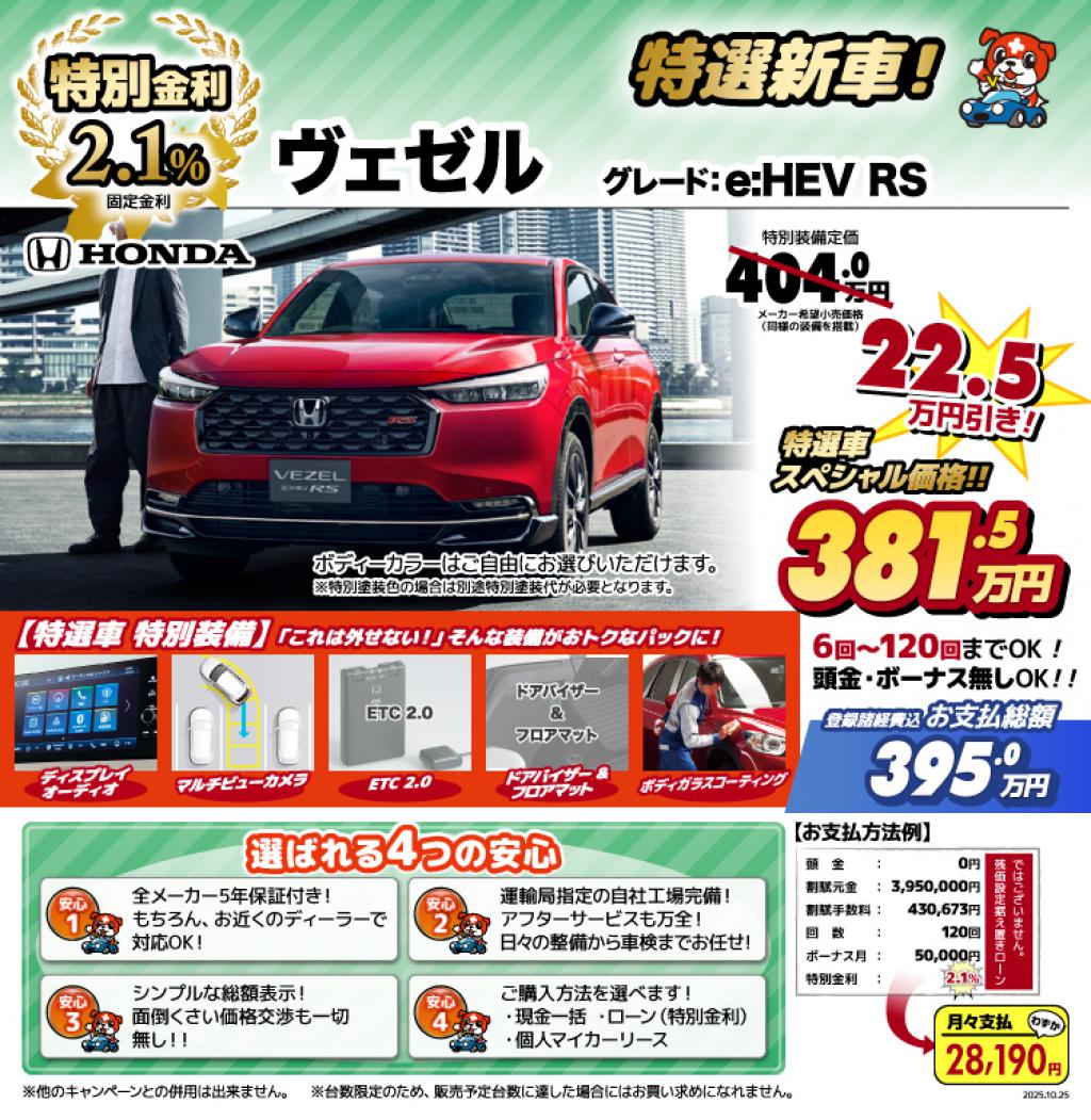 車輌:【限定5台枠】ヴェゼル e:HEV RS(お好きなボディーカラーをお選び頂けます)
